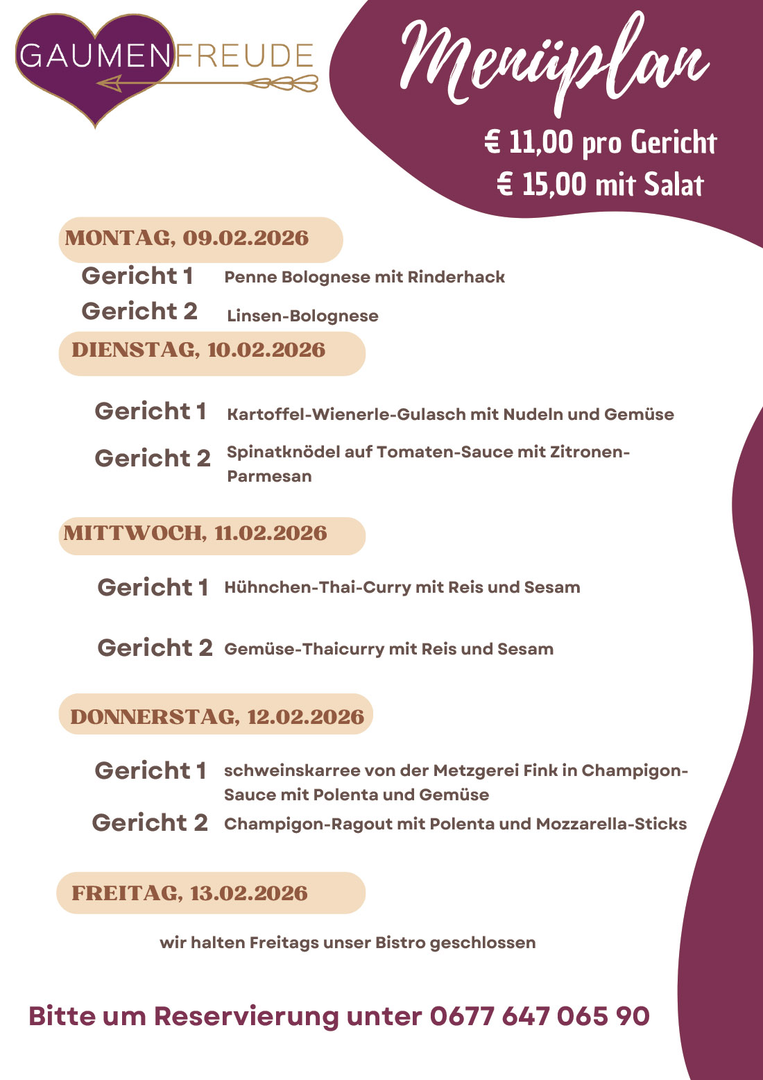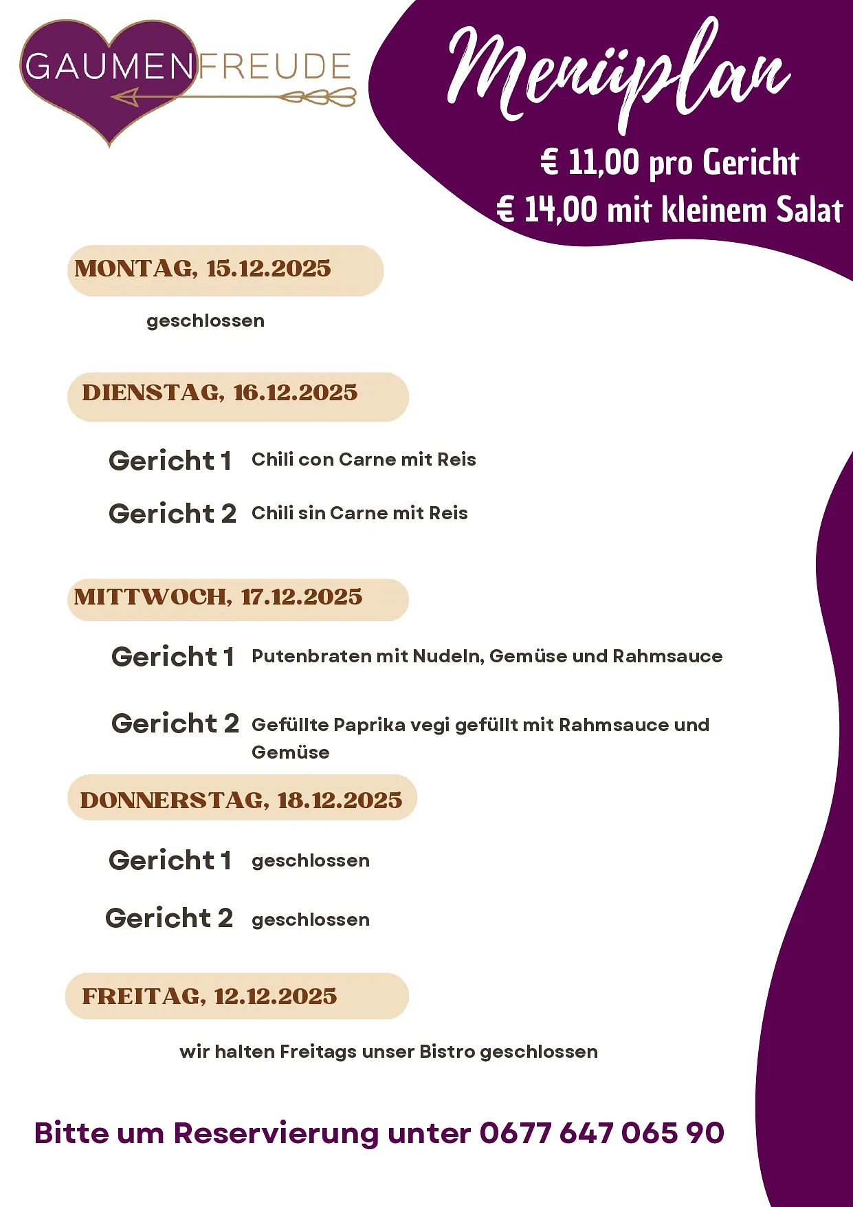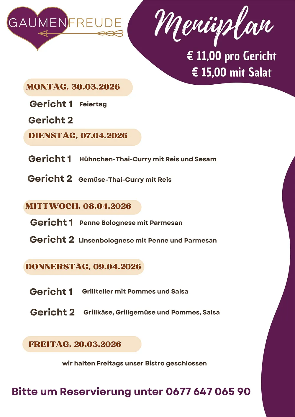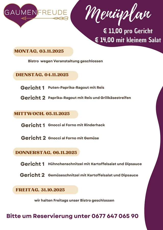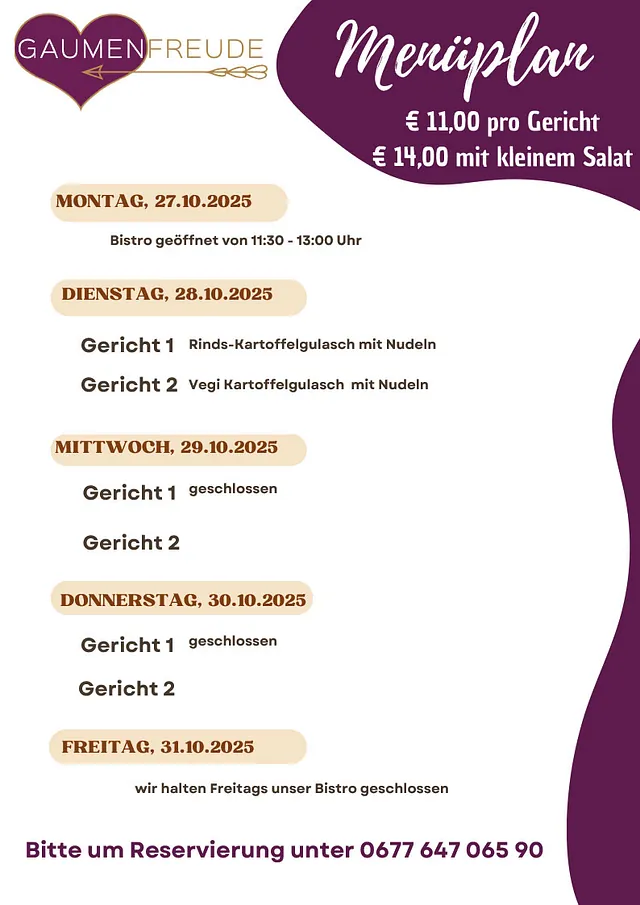 Genieße von Montag bis Donnerstag täglich ein frisch zubereitetes Gericht aus hochwertigen Zutaten. Unsere abwechslungsreichen Menüs bieten gesunde, vollwertige Mahlzeiten, die sättigen und Energie liefern. Am Freitag gilt unsere reguläre Speisekarte mit einer Auswahl an köstlichen Spezialitäten. Reserviere dein Menü rechtzeitig unter 0677 647 065 90. Preis: € 11,00 pro Gericht oder € 14,00 mit kleinem Salat. Lass dich von unseren gesunden und kreativen Gerichten verwöhnen!
